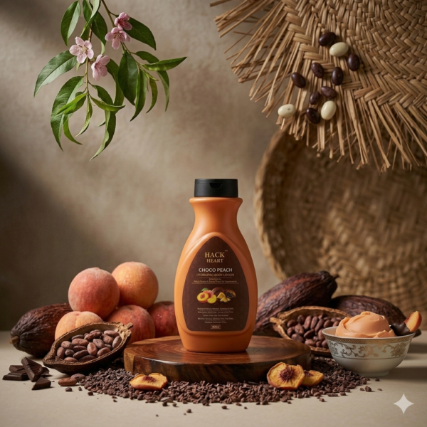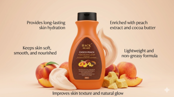 Hack Heart Choco Peach Hydrating Body Lotion is a nourishing formula designed to deeply moisturize and soften your skin. Enriched with peach extracts and cocoa butter, it helps restore natural glow while keeping your skin smooth and supple. Its lightweight, non-greasy texture absorbs quickly, providing long-lasting hydration throughout the day. The delightful choco-peach fragrance leaves your skin feeling fresh and rejuvenated. Perfect for daily use, it enhances skin texture and protects against dryness. Suitable for all skin types