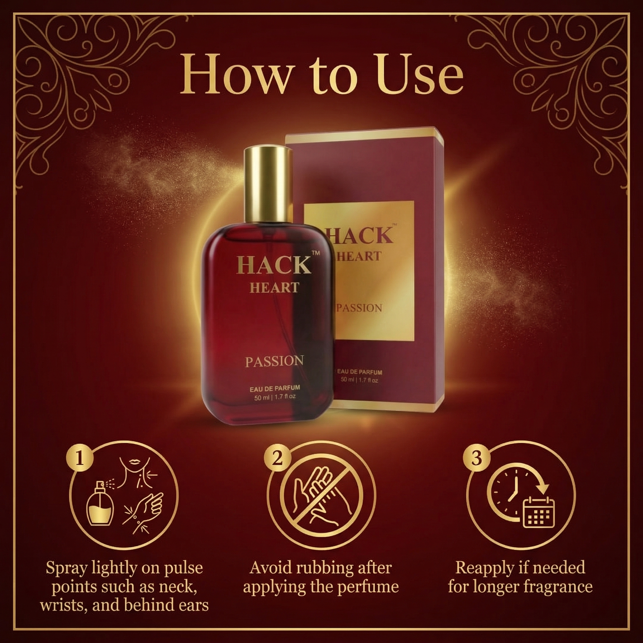 Hack Heart Passion Eau De Parfum is a bold and captivating fragrance crafted to leave a lasting impression. Its rich and sensual aroma blends warm and floral notes, creating an irresistible and elegant scent. Designed for long-lasting freshness, it keeps you confident and refreshed throughout